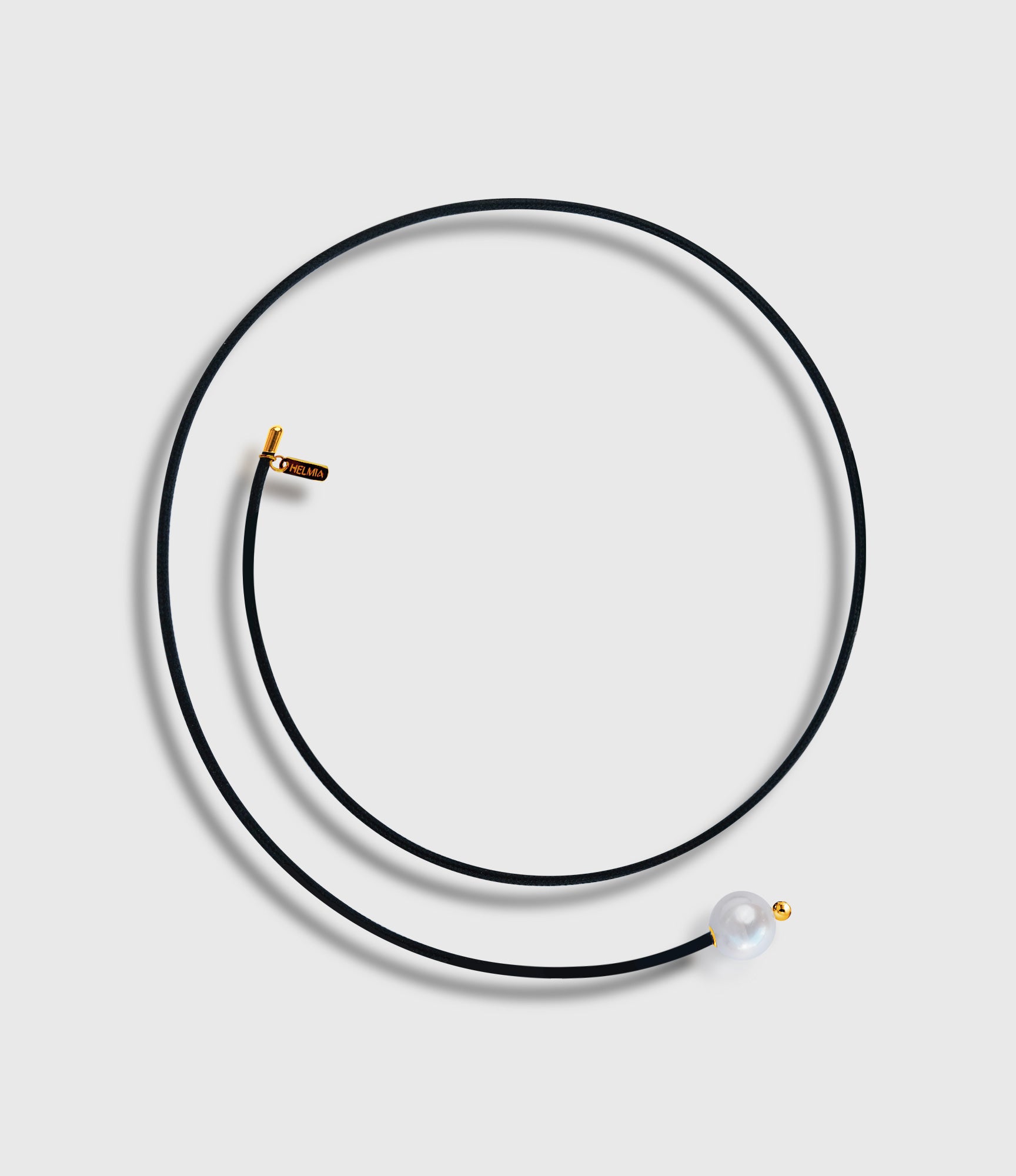 Minimal in structure, maximal in intention—the Épure Mono Necklace / Bracelet is a singular expression of form and fluidity. A luminous freshwater pearl, approximately 12 mm in diameter, is cradled by a soft, curved line of matte black magnetic cord. The connection is seamless—held by tension, magnetism, and pure design.