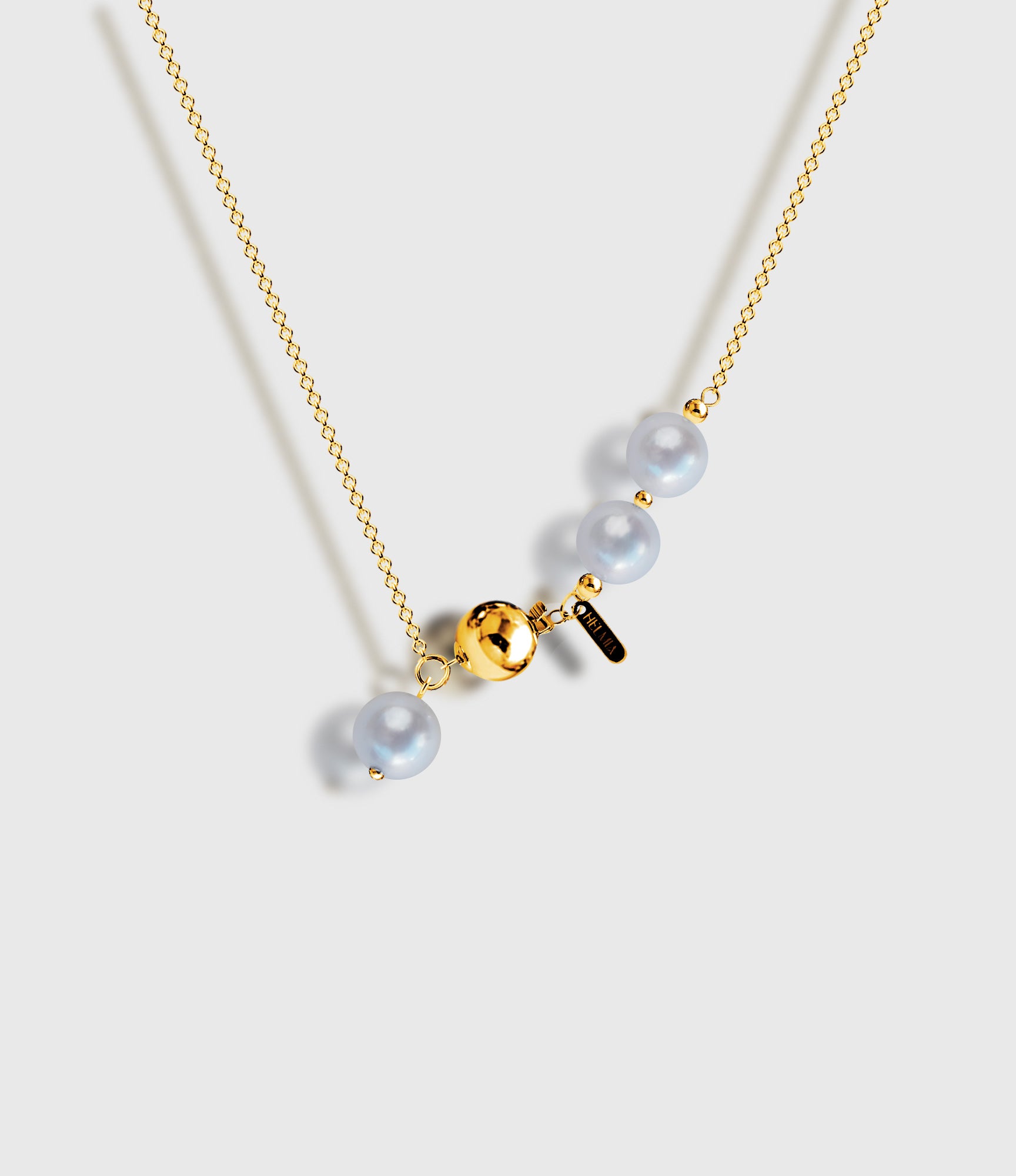 Three radiant 9 mm freshwater pearls are aligned in a clean, linear composition, joined by a polished 18k gold vermeil sphere. The arrangement suggests balance and restraint, yet the final pearl shifts just slightly—trailing behind the formation, as if resisting the rules. It’s a small deviation, but a bold statement—adding character, movement, and a spark of spontaneity to an otherwise minimal design.