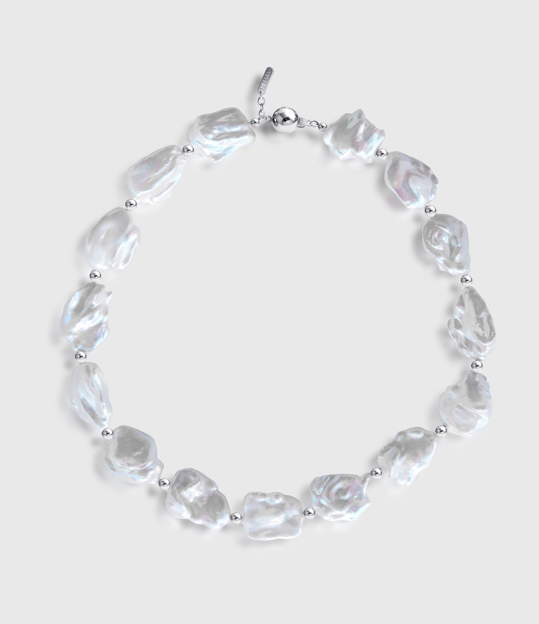 Each keshi pearl is one of a kind—formed without a nucleus, its surface ripples with light and natural asymmetry. Its organic volume contrasts the precision of the curved silver bar above, creating a powerful interplay of softness and structure, chaos and control.
